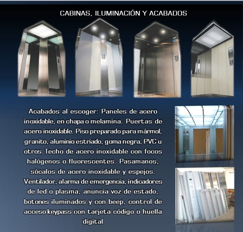 Acabados al escoger: Paneles de acero inoxidable, en chapa o melamina. Puertas de acero inoxidable. Piso preparado para mármol, granito, aluminio estriado, goma negra, PVC u otros. Techo de acero inoxidable con focos halógenos o fluorescentes. Pasamanos, zócalos de acero inoxidable y espejos. Ventilador, alarma de emergencia de led o plasma, anuncia voz de estado, botones iluminados y con beep, control de acceso keypass con tarjeta código o huella digital.